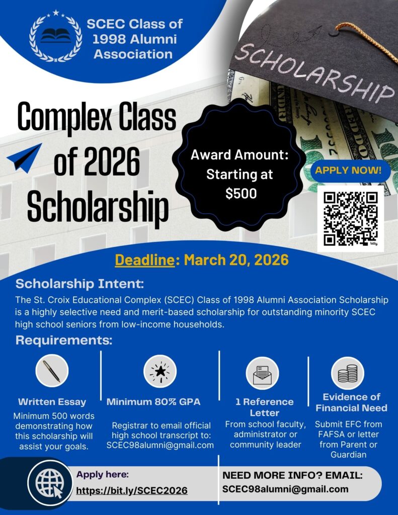 The St. Croix Educational Complex (SCEC) Class of 1998 Alumni Association Scholarship is a highly selective need and merit-based scholarship for outstanding minority SCEC high school seniors from low-income households.